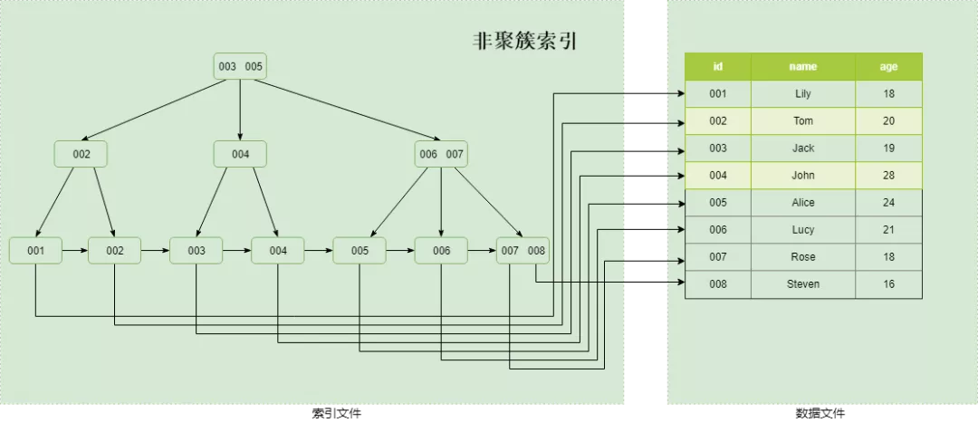根据数据与索引的存储关联性,可以分为聚簇索引和非聚簇索引(也叫聚集索引和非聚集索引)。聚簇索引也叫簇类索引,是一种对磁盘上实际数据重新组织以按指定的一个或多个列的值排序。整个简洁的说法,这俩的区别就是索引的存储顺序和数据的存储顺序是否是关系的,有关就是聚簇索引,无关就是非聚簇索引。具体实现方式根据索引的数据结构不同会有所不同。下面以B+树实现的索引为例,举例来说明聚簇索引和非聚簇索引。