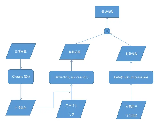 多臂du-bo-机问题中,测试者根据策略多次尝试选择不同的臂,根据反馈来迭代更新各个臂的获胜概率。直播推荐中,由于在线主播较多,而用户同一时间只能观看一个主播,且手机上屏幕较小,一屏内仅能展示少数几个主播。如果直接将主播对应为多臂du-bo-机的一个臂,将一次展示(曝光)作为尝试,一次点击/观看作为获胜来进行建模,则会有很多臂得不到更新。为此我们做了一些修改,对主播聚类,将类别作为臂,计算用户对类别的bandit得分。
