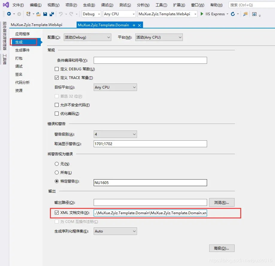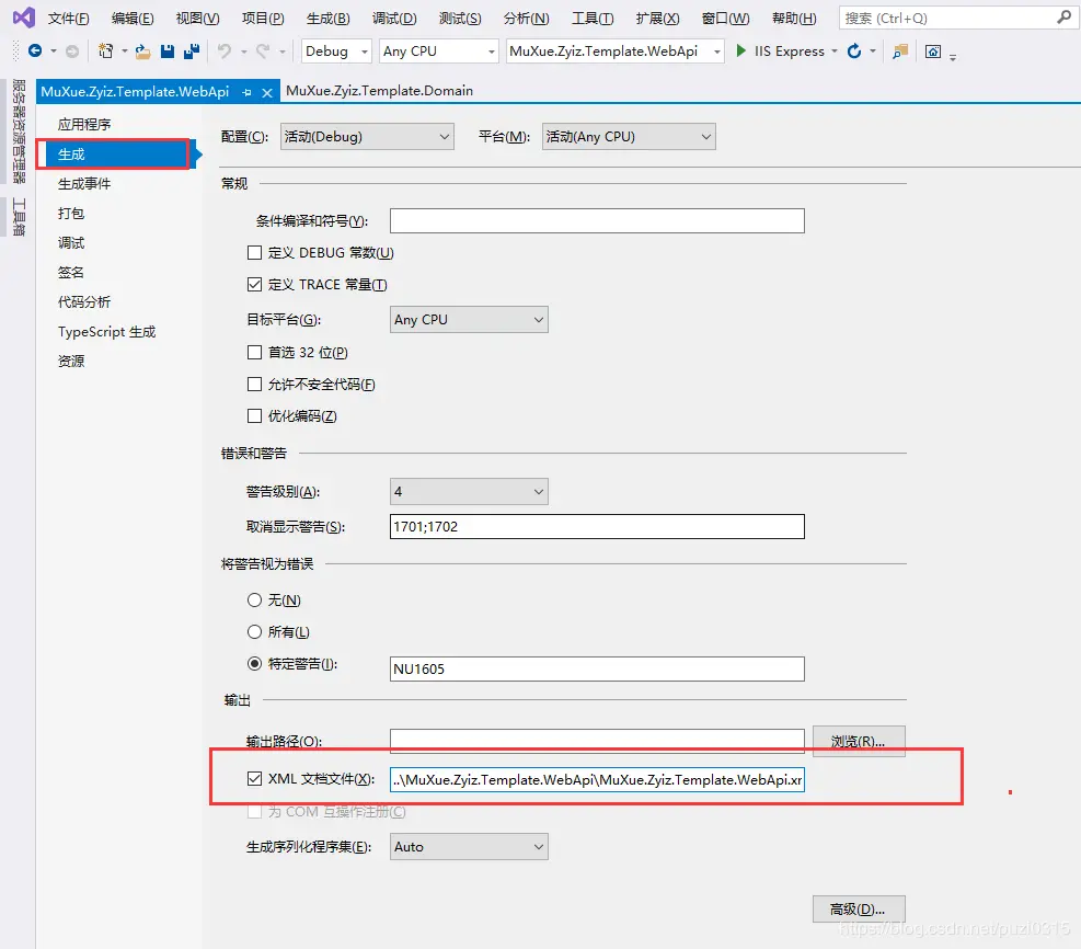 1、解决方案-WebApi项目名右击---“属性”,点“生成”,界面下方,“输出”部分,勾选“XML文档文件(X)”,可以看到生成的路径为绝对路径,可以改为相对路径,类似这样,加2个点好,然后是WebApi项目目录名,后面的xml文件名不变。
