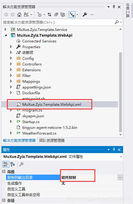 有人发现,本地的swagger有字段说明,但是发布到服务器上,就没有字段说明,原因是.netcore 3.1发布后,不会生成xml文件。解决方方法是,在vs2019项目里,刚刚我们设置成功生成的2个xml文件,右击-“属性”-“复制到输出目录”设置为“始终复制”即可。