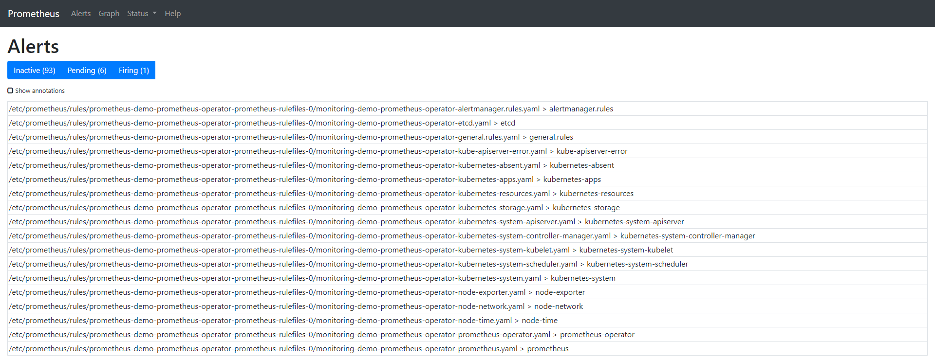 “Alert”选项卡向我们展示了所有当前正在运行/已配置的告警。也可以通过查询名称为prometheusrules的CRD从CLI进行检查: