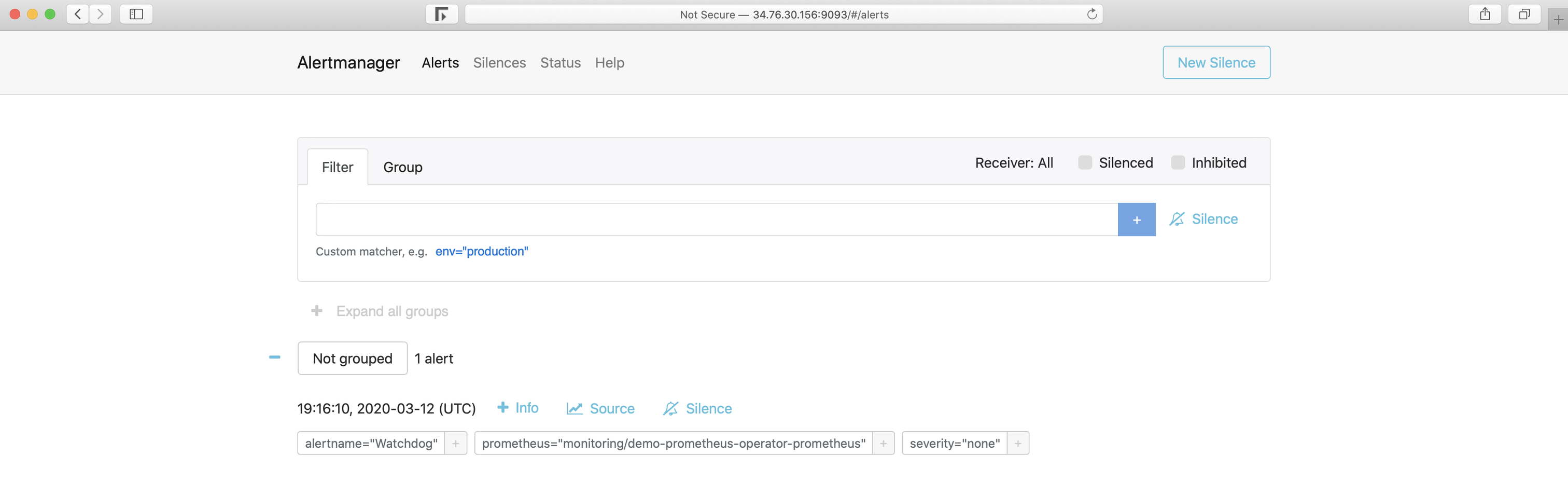 告警一旦触发,将会在Alertmanager中显示: