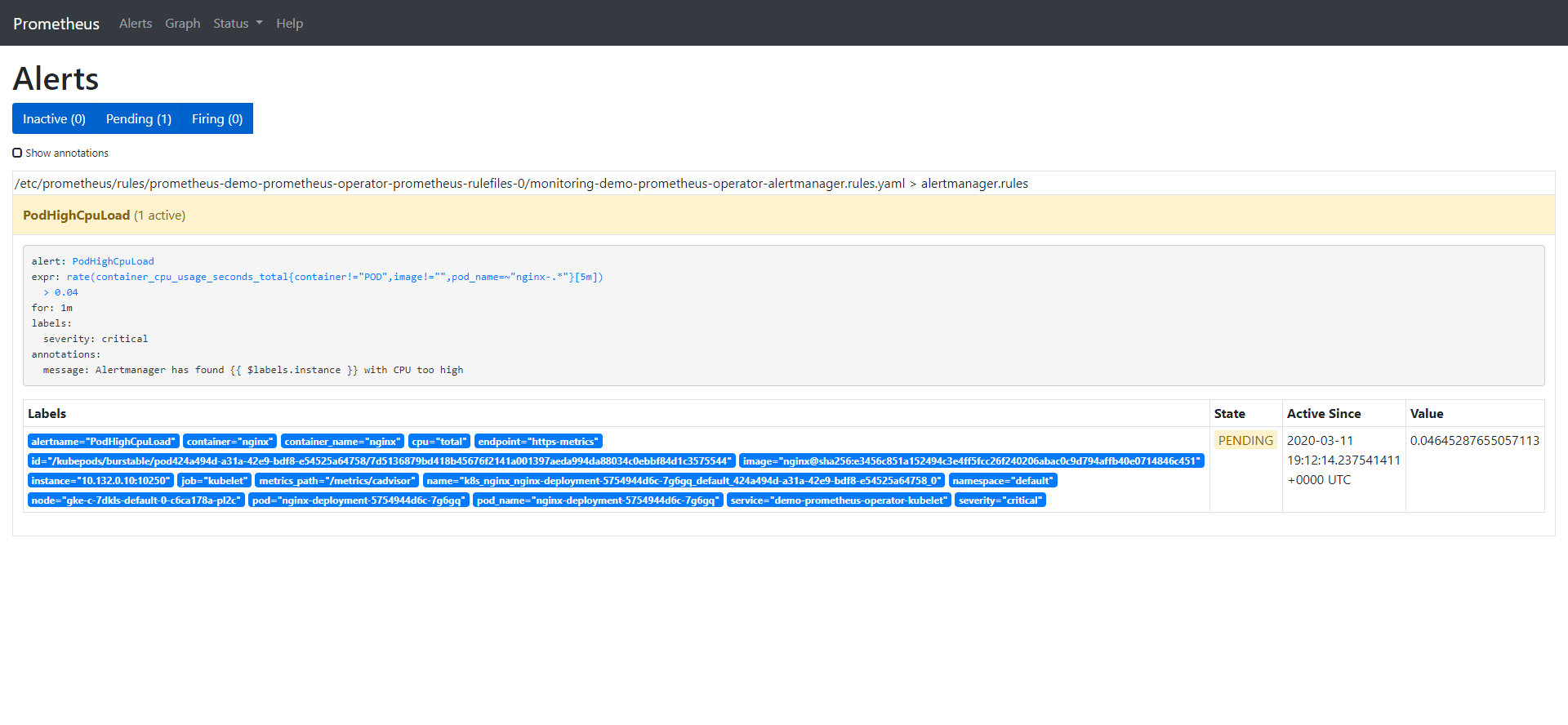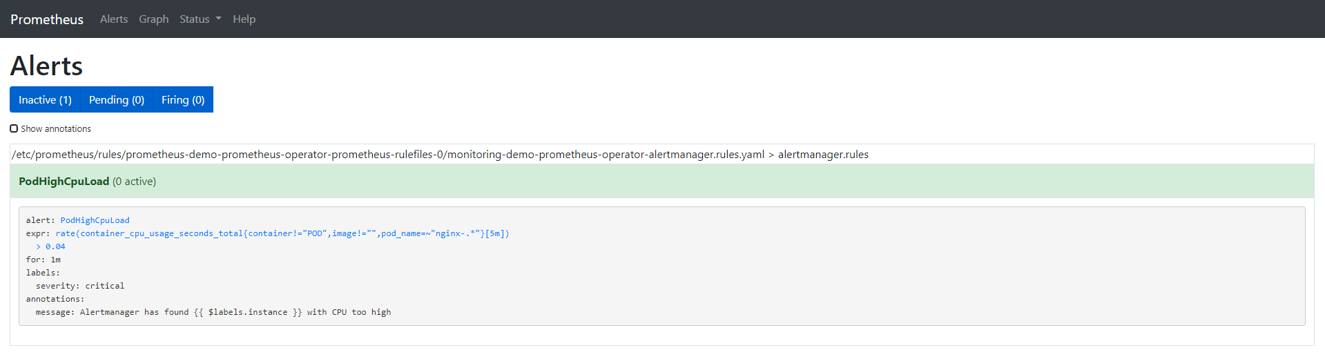 我们已经看到告警处于inactive状态,所以在CPU上添加一些负载,以观察到剩余两种状态: