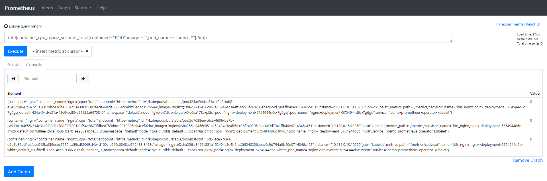$ kubectl port-forward --address 0.0.0.0 -n monitoring prometheus-demo-prometheus-operator-prometheus-0 9090 >/dev/null 2>&1 &