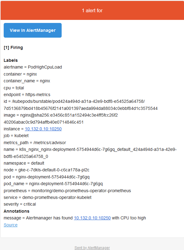 Alertmanger配置为当我们收到告警时发送邮件。所以此时,如果我们检查收件箱,会看到类似以下内容: