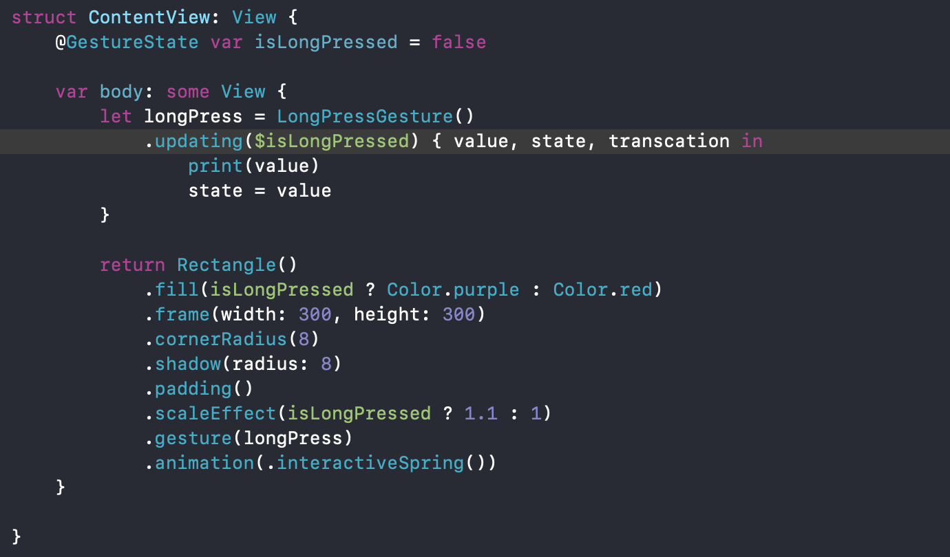 示例中,我们声明一个@GestureState修饰的布尔变量,来存储当前的长按状态,当被按下的时候更新view的背景色及大小。通过对Gesture增加update调用来更新isLongPressed,进而更新对应的View。此外我们在更新isLongPressed的闭包中增加了对value的打印,每次按下的时候都会将isLongPressed更新为true,在手势结束的时候自动将绑定的属性恢复为初始值。我们可以看下update的方法声明: