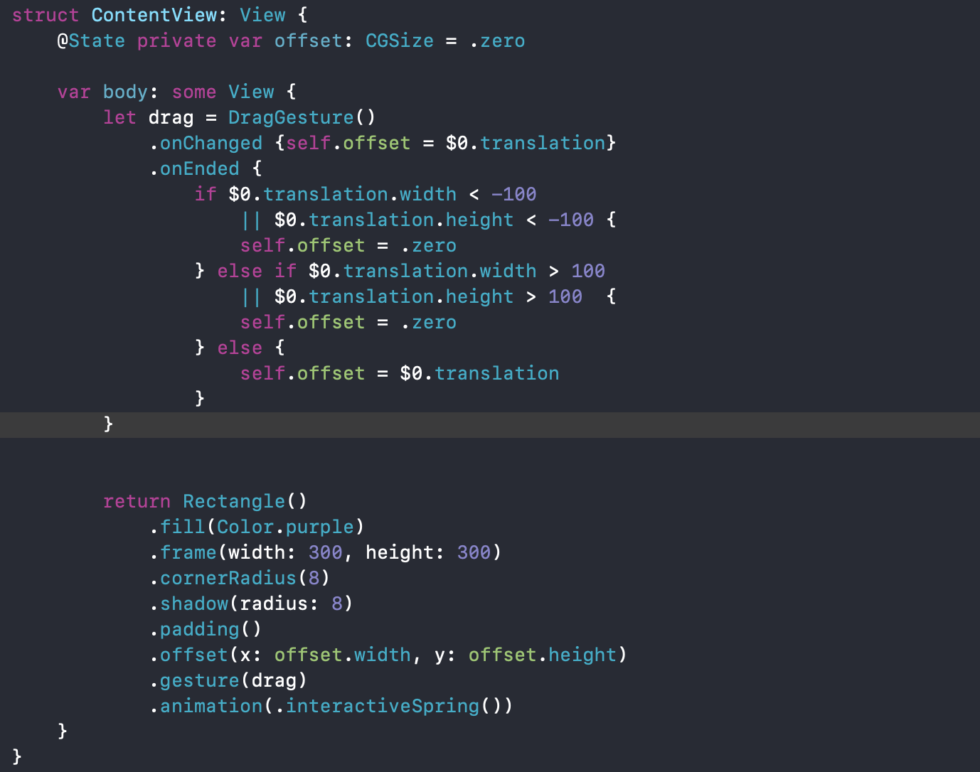在前一小结的基础上,我们将通过DragGesture来实现对色块的拖动,在拖动结束后,检查拖动后的位置,如果超出了屏幕范围,则恢复到初始位置,否则停留在拖动结束的位置。通过前一小结学习到,在手势结束时SwiftUI会自动将@GestureState修饰的属性值恢复为初始值,在这里为了避免拖动结束时自动恢复到初始位置,我们使用@State来修饰View的拖动位置属性。代码实现如下: