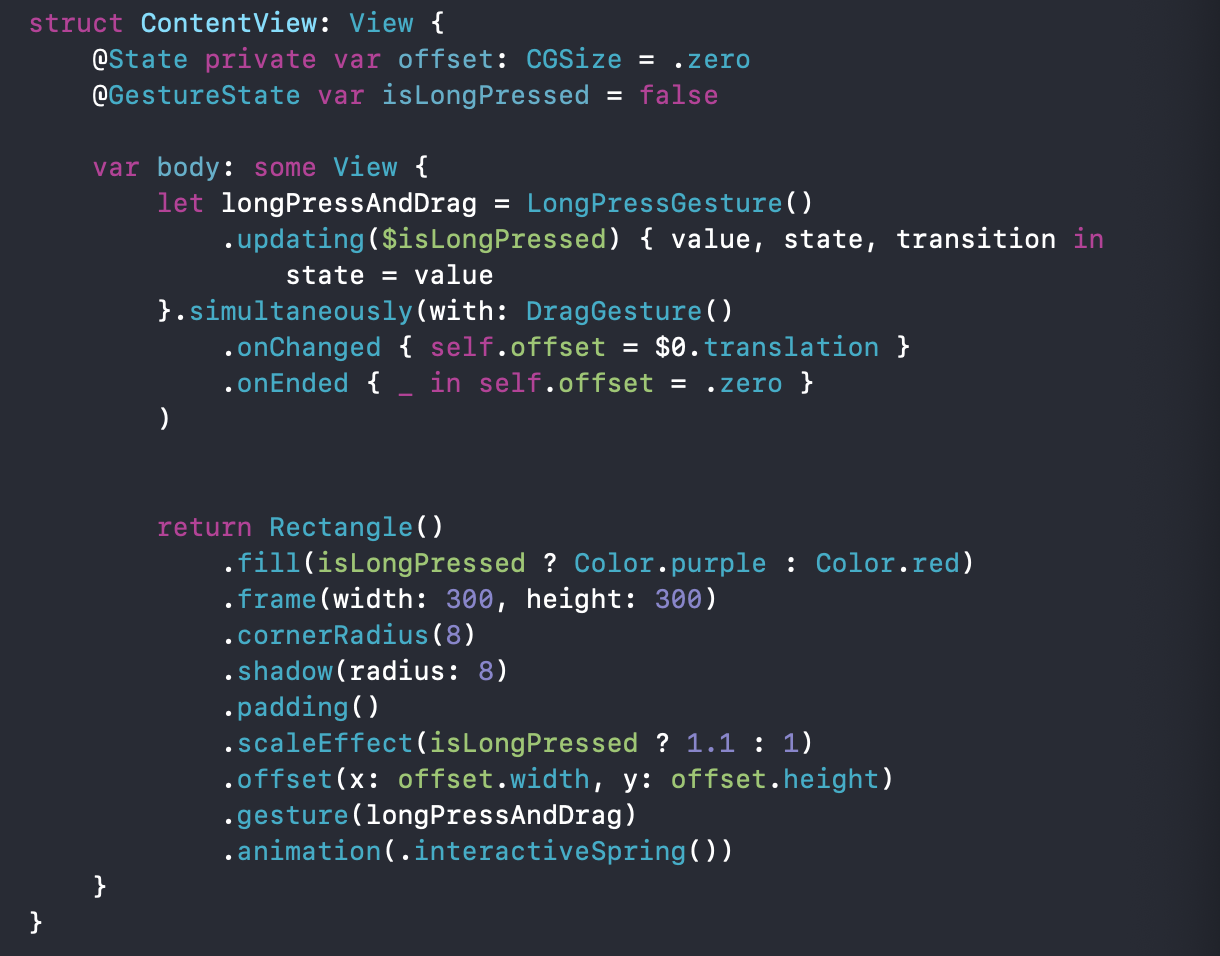 SwiftUI提供了一系列的手势支持,比如 TapGesture, DragGesture, RotationGesture, MagnificationGesture, LongPressGesture等。我们可以通过对View添加modifier来增加手势支持,比如下面这块代码: