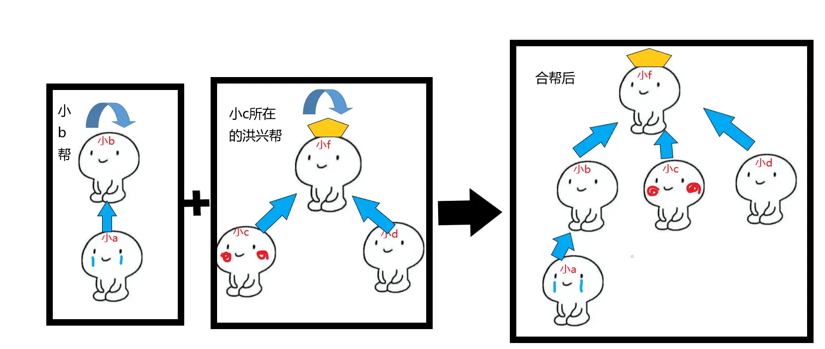 小a想要加入小b的帮派,怎么做呢?将a的老大改成b,b的老大保持不变,记成: