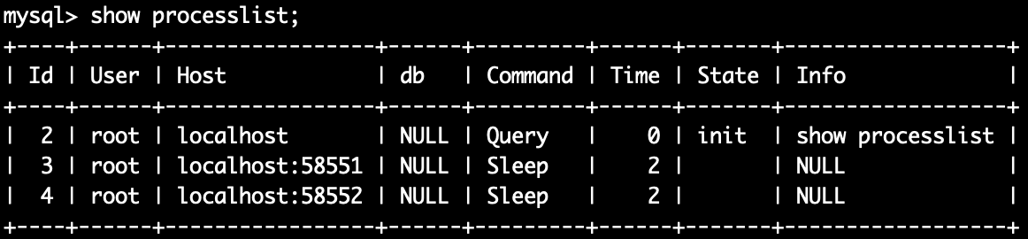 查看连接线程状态 show processlist,show full processlist (前者只能查看前100条,后者可以看全部)