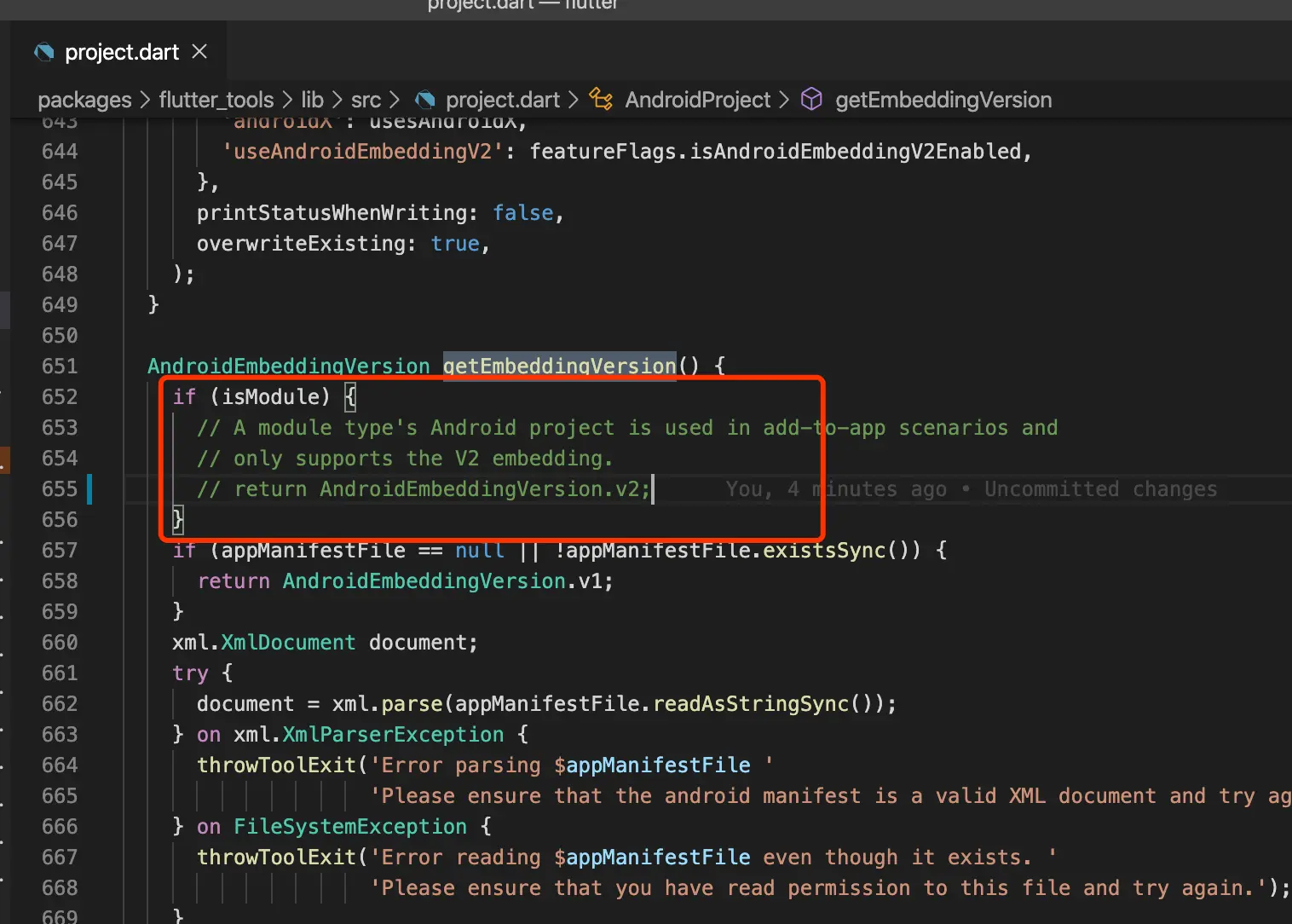 修改 getEmbeddingVersion 判断逻辑 注释掉针对 flutter module的特殊处理