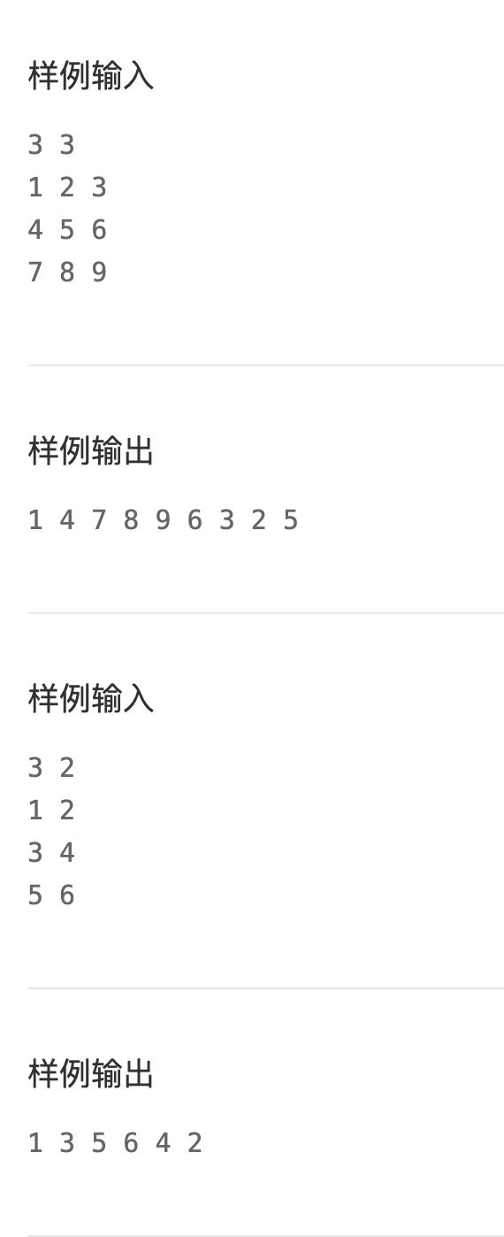 一看到题目中有矩阵,并且要输入m行,n列,我第一反应就是这题应该和二维数组有关。 根据题目题意画了下面这个草图: