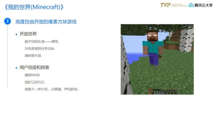 当前世界上用户和玩家人数最多的、市值最高的一款世界游戏的当属「我的世界」。它是一个高度自由开放的像素方块游戏,玩家可以在这个世界当中进行探索。不像传统游戏那样,有游戏任务目标、副本、主线,在这里没有直接的任务目标,玩家最大乐趣就是在里面制作一些建筑,以及完成一些简单的小任务。这款游戏是源码级开放的,用户可以改到源码层面,这样就会带来非常大规模的游戏体量上的创造,也就是用户的创造和探索。