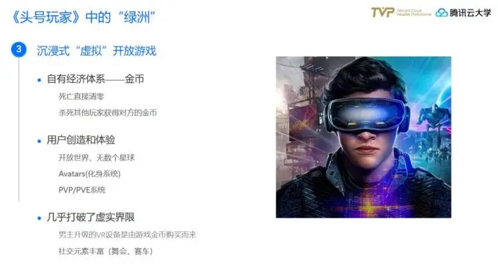在2018年斯皮尔伯格导演了一部电影—头号玩家,电影当中有一款游戏叫做绿洲。绿洲可以说就是前文提到的两款游戏的一个升级版本,或者说是一种完全体。游戏是完全开放的,玩家在里面可以做很多的事情。对于这款游戏本身而言,也有一些比较有特色的地方,比如它有一个自由的经济体系,玩家在绿洲中所获得的游戏币,是可以拿出来在现实中做交易的。例如,头号玩家主角升级版的体感设备就是他通过打游戏获得的。