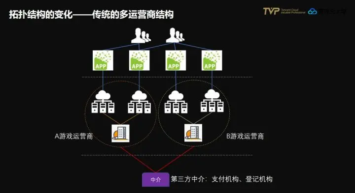 左边是A游戏运营商,右边是B游戏运营商,传统游戏的现状可能是这样:假设A和B游戏运营商都运营了两款游戏,拥有两台服务器。可以看出,A游戏运营商和B游戏运营商基本没有关系,即使有关系可能也只是支付关系。例如用户可能在游戏中产生一笔支付,都接入到第三方中介平台,如支付机构、登记机构等。这是一个非常弱的关系,跟游戏本身几乎没有任何联系。如果把中介拿掉,对游戏本身其实是没有任何影响的。而如果这两个游戏运营商都加入区块链的话,变成如下这样的拓扑结构,游戏立马就能被打通了。
