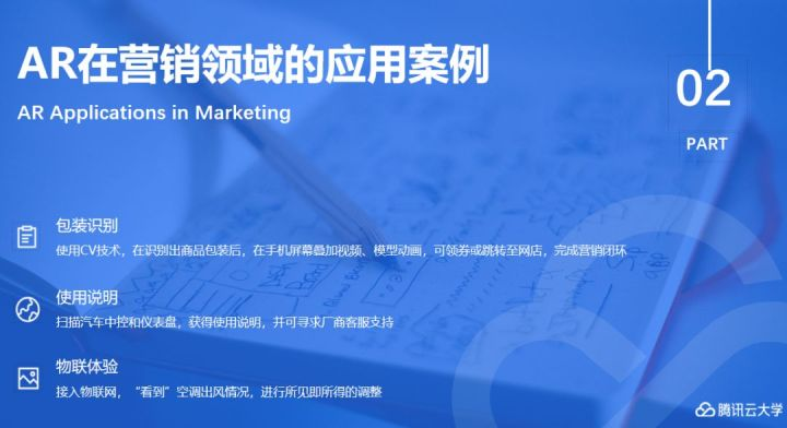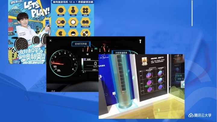 如果各位平常留意的话,就会发现有时候用手机扫描商品包装,界面上会浮现叠加的一些视频动画,然后用户可以领券,或者跳接到网店地址等,完成营销的闭环,这是目前大家可能最常见的应用。
