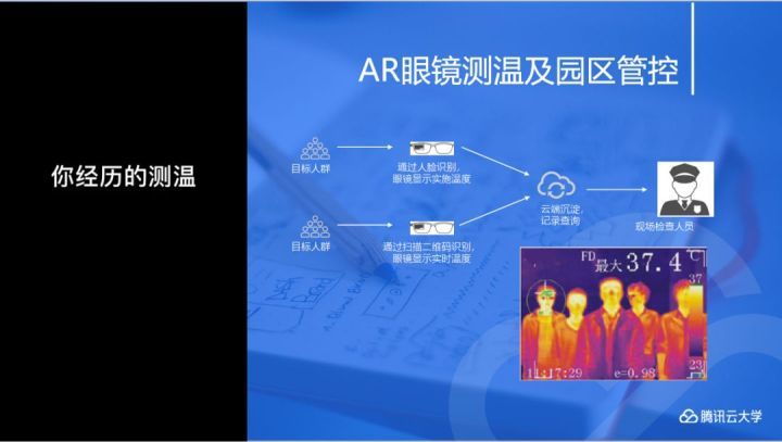 应急管理,尤其是在疫情发生的情况下,还有一个特别AR的应用,就是AR眼镜测温。