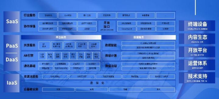 首先要了解AR这个技术。它是由哪些部分构成的,有哪些层面?最下面的IaaS的平台,大多数AR的从业人员不会太接触到,基本上我们也是用运营商或平台厂商的一些基础设施。往上面看是通讯数据包括引擎和应用,也就是从DaaS到PaaS的层面都是需要各个方面的软件技术人员来参与的。