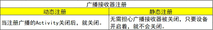 - 而broadcast receiver广播接收者的注册分静态注册(在AndroidManifest文件中进行配置)和通过代码动态创建并以调用Context.registerReceiver()的方式注册至系统。