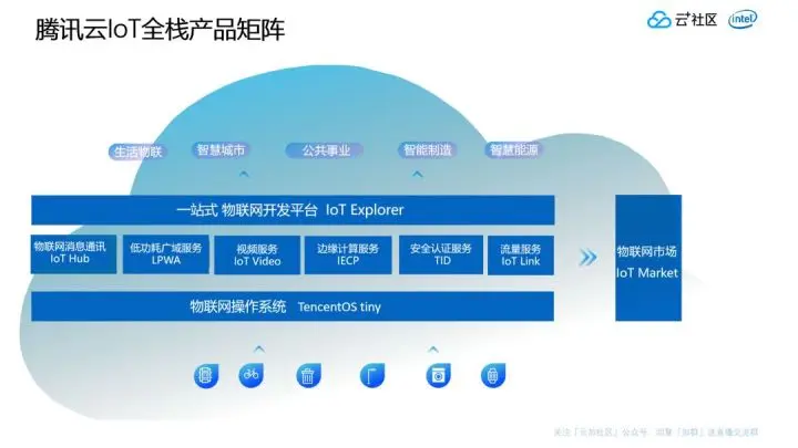A:腾讯云IoT定位于全链路物联网基础设施建设者,通过搭建物联网覆盖云管边端的基础设施能力,为企业实现物联网信息化提供优质可靠的基础设施能力,降低物联网的开发门槛和复杂度,助力业务快速上线。在云侧,物联网开发平台IoT Explorer整合腾讯云的大数据、AI智能、图像视频、安全和无服务计算等产品能力,为各行业的设备制造商、方案商及应用开发商提供一站式设备智能化服务;在边侧,各类服务发挥协同优势。在管道侧,LPWA物联网络是为传感终端提供用于通讯的基础网络。具备建网方式灵活;低成本提供稳定的网络覆盖,节约建网成本,降低物联通讯费用等特点;在边缘侧,ECM和IECP共同为用户提供就近的边缘计算服务,完成云、边的服务协同;在端侧,TencentOS tiny是腾讯面向物联网领域开发的实时终端操作系统,具有低功耗、低资源占用、模块化、可裁剪等特性。可以有效减少开发人员所需要的时间和产品成本,并且能够快速高效的实现设备的低功耗运行,同时提供强大的开发调试功能,提高测试效率,能够保障产品实现快速开发和上线交付。