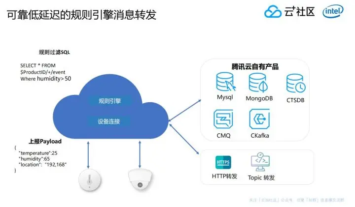 如何确保可靠之余还能够做到低延时?通过增加规则引擎这样的功能就可以实现数据在不同模块之间进行转发。腾讯云自己有像MangoDB、Kafka等等不同产品,这些不同产品内部切换起来非常快,其实就依赖于我们做的规则引擎模块,现在消息引擎转发的消息量已经达到了几十亿的级别。