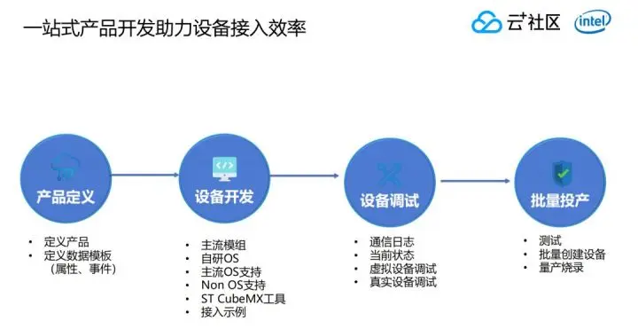 当把设备开发完以后,这个时候就应该开始批量投产了。我们提供了大量的批量化操作,包括Device ID如何分配,批量化设备如何管理,量产后的固件如何烧录,设备上线以后如何控制权限等等。我们已经把物联网应用开发过程的整体流程缩得很短,并且把流程可规避的问题,以及能够缩短的时间拆分到以上四个环节里面,客户和开发者只要按照以上流程选择适合他们的开发方式就可以很快开发。