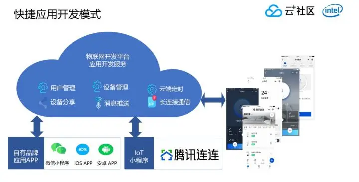 腾讯也有自己的语音开发平台,我们会把对应能力相互打通。并且大家可以看出,在loT Explorer里面也可以集成不同的语音开发能力,包括一些消息推送的功能,这些都是经由很多客户反馈,最终我们把它们抽象做成一种公共的服务提供给所有人使用。