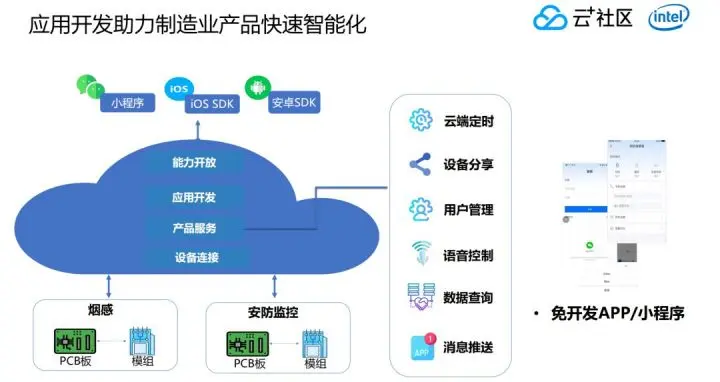 我们在其上提供了很多的应用能力,包括OTA升级能力、数据统计分析能力,设备管理能力,用户权限能力,甚至现在还提供了像实时计算,持续分析,告警通知位置,AI算法模型等。再往上到应用层,支持常规 iOS和安卓App开发,同时提供SDK。去年年底我们开始大力支持小程序。未来会为开发者提供更多无缝对接小程序能力,并且会提供更多小程序插件,满足各个行业需求。