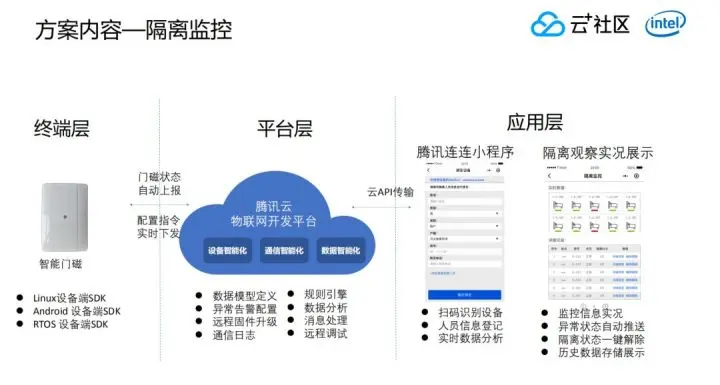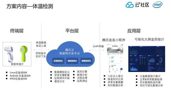 特殊时期,社区等单位的管理提出了“零接触”新需求。如何基于物联网开发平台和腾讯连连小程序快速上线面向家庭/社区单位的产品服务,实现疫情管控“零接触”数字化管理?本文是周佳鑫老师在「云加社区沙龙online」的分享整理,详细带大家了解物联网项目开发流程、腾讯云物联网开发平台技术优势,以及如何借助loT Explorer和腾讯连连小程序快速开发上线新型体温检测产品。