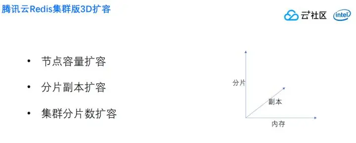 腾讯云Redis怎么扩容呢?我们的扩容从三个维度出发,单个节点容量扩容, 比如说三分片,每个片4G,我们可以每节点扩到8G。单节点容量扩容,一般来说只要机器容量足够,就可以扩容上去。还有副本扩容,现在客户使用的是一主一从,有的同学开读写分离,把读全部打到从机,这种情况下,增加读qps比较简单的方法就是增加副本的数量,还增加了数据安全性。最近的实际业务,我们遇到的主要是扩分片,对于集群分片数,最主要就是CPU的处理能力,扩容分片就是相当于扩展CPU,扩容处理能力也间接扩容内存。