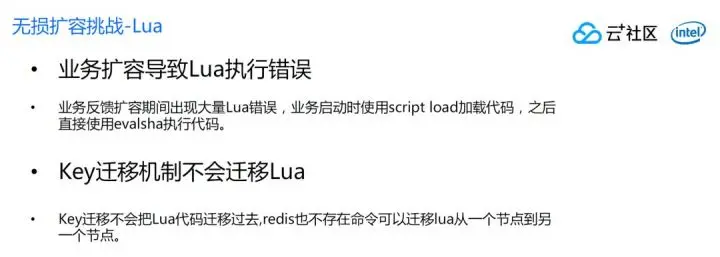 假如业务启动的时候通过script load加载代码,执行的时候使用evalsha来,扩容是新加了一个进程,对于业务是透明,所以按照Redis开源版的办法搬迁Key,key搬迁到目标节点了,但是lua代码没有,只要在新节点上执行evalsha,就会出错。