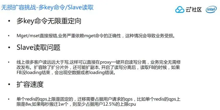 还有一个挑战,就是多Key命令,这个是比较严重的问题,Mget和mset其中一个Key在源进程,另外一个Key根本不存在或者在目标进程,这个时候会直接报错,很多业务严重依赖于mget的准确性,这个时候业务是不能正常工作的。