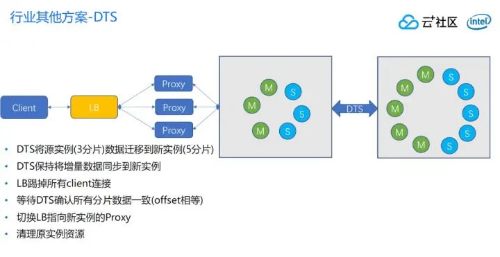 切换首先观察是不是所有DTS延迟都在阈值内,这个延迟指的是从这边Master到那边Master的中间延迟。如果小于一定的数据量,就可以断连客户端,等待一定时间,等目标实例完全追上来了,再把LB指向新实例,再把源实例删除了。一次扩容就完全实现了,这是行业比较常见的一种方案。