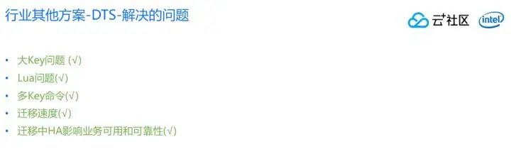 DTS方案解决什么问题呢?大Key问题得到了解决。因为DTS是通过源进程slave的一个进程同步的。Lua问题有没有解决?这个问题也解决了,DTS收到RDB的时候就有lua信息了,可以翻译成script load命令。多Key命令也得到了解决,正常用户访问不受影响,在切换之前对用户来说无感知。迁移速度也能够得到比较好的改善。迁移速度本身是因为原实例通过rdb翻译,翻译之后并发写入目标实例,这样速度可以很快,可以全速写。这个速度一定比开源版key搬迁更快,因为目标实例在切换前不对外工作,可以全速写入,迁移速度也是得到保证。迁移中的HA和可用性和可靠性也都还可以。当然中间可用性要断连30秒到1分钟,这个时间用户不可用,非常小的时间影响用户的可用性。