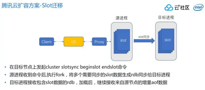 再就是在目标进程发起slot命令,这个命令执行后,目标节点根据slot区间自动找到进程,然后对它发起sync命令(带slot的sync),源进程收到这个sync命令,执行一个fork,将所有同步的slot区间所有的数据生成rdb,同步给目标进程。
