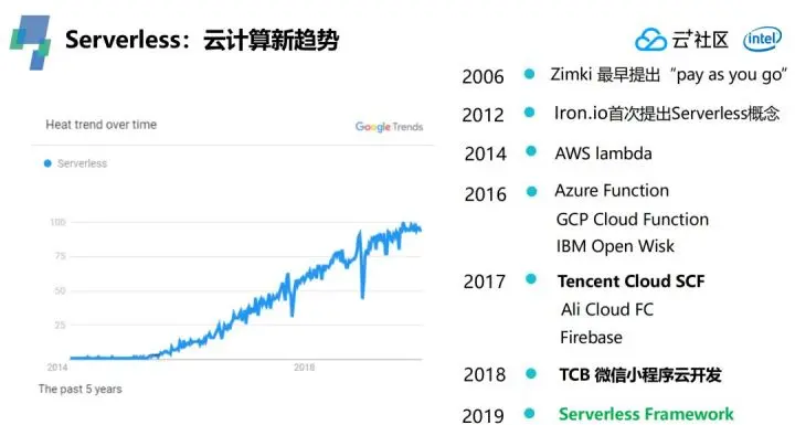 从2014~2020年,这几年Serverless关键词的谷歌搜索指数与日攀升,现在已经成为了非常火爆的技术名词。其实早在2006年就有人提出Pay as you go的概念,需要多少就买多少,但直到2012年,Serverless首次被提出。2014~2016年,大型云厂商纷纷发布函数计算相关的产品支撑这样一个无服务器技术。
