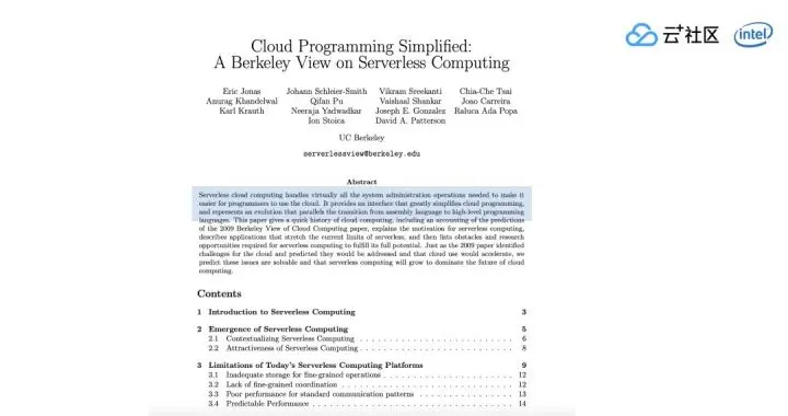 这不是一个定义,但是却是实现Serverless一个具体方法。Serverless真正的含义又是什么呢?在这篇论文最核心的摘要部分,对Serverless的概念做了一个说明。翻译成中文就是:无服务器云计算,它几乎封装了所有底层资源管理和系统运维工作,使开发者更容易使用云基础设施。