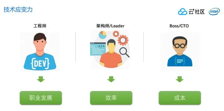 对于架构师和技术leader来讲,“技术应变力”意味着什么呢?设想,如果老板问一个技术leader,你的团队有没有技术应变力,这是什么意思?“技术应变力” 对技术leader来讲,指的就是团队工作能力的应变性。原来做产品A,现在要求做产品B,你能不能用现在的团队,用现在的技术架构,把产品B很快的做出来?Serverless 很大程度上帮助技术团队提升这一种能力。Serverless帮助技术团队解决底层所有资源分配。技术团队不需要再管这些,只要把精力放在核心业务逻辑上,在提高了生产效率的共识,增加了应变性。
