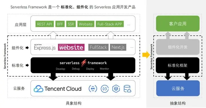 ServerlessFramework就是这样一个组件化、标准化的Serverless应用开发产品。它提供一套非常标准的开发者接口,包括开发、部署、调试、监控,和底层的异构云厂商完全进行隔离,你看到的是完全面向开发者的视图,原来是怎么开发的现在完全不用改变。