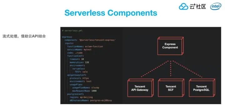 组件化方面,Serverless Framework按照业务的维度提供了不同的组件。例如它提供了Expres组件,如果你原来的应用是基于Express开发的,你就可以直接用该组件把原来的应用迁移到Serverless上面来。同时,这个框架提供了研发到上线的全生命周期管理和支持,包括从开发、调试,联调、测试、部署,整套DevOps的流程都被框架所支持。