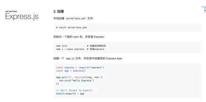 Serverless Framework是一个很有弹性的框架。所谓弹性,如果你是一个资深开发工程师,它提供很多的自定义的项目可以供你配置,比如:部署代码的地区,自定义的域名,是不是采用HTTPS服务等,都是可以通过配置实现的。相反,如果你是一个初学者,你也可以不需要改一行代码,即使用组件的默认配置,默认serverless.yml,也可以完成使用。以Express.js为例: