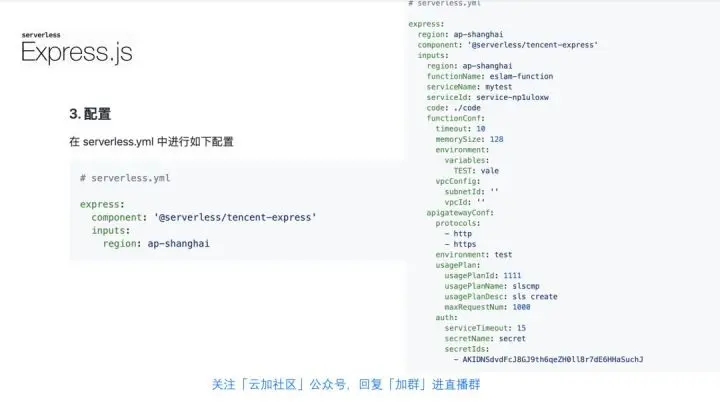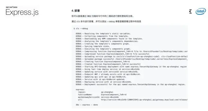 从上图大家可以看到,如果你需要对Express做很深度的定制,这里还有一大堆配置项可以使用,包括内存的管理,超时管理都可以在这里进行配置。最后用sls(serverless的缩写)命令,用数十秒完成了上云部署。