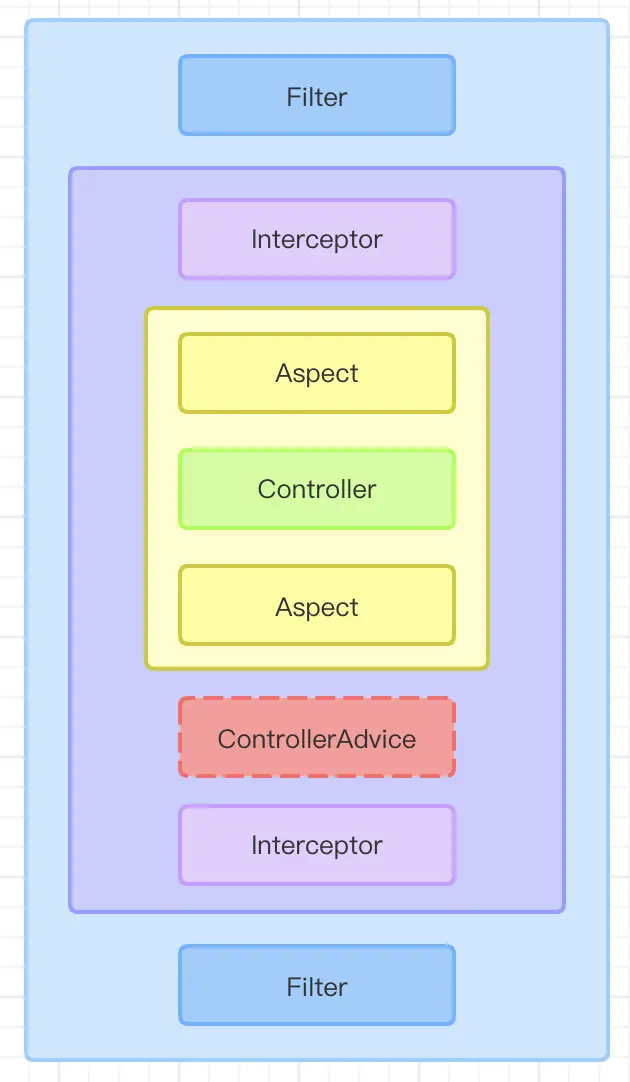 Spring 中 过滤器、拦截器、切面的执行顺序 我妻礼弥 2020-03-24 2,930 阅读1分钟 各“组件”层次如上图所示,Filter 在最上层,Controller 是我们的业务处理类,在最里层。 当请求经过 Servlet后,执行顺序如下 唯一值得说明的是,当 Controller 抛出的异常 Aspect 没有处理时,如果该异常能被 ControllerAdvice 捕获,则 ControllerAdvice 会处理该异常。