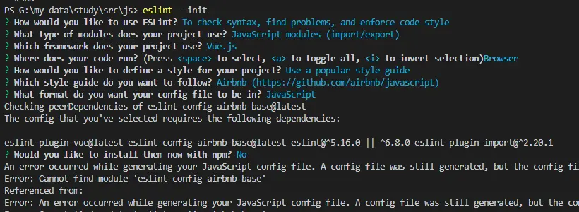 图片蓝色部分是已选择的项,最后一步? Would you like to install them now with npm? No我选择No,等init完成后再用npm依赖 npm i --save-dev eslint-plugin-vue eslint-config-airbnb-base eslint-plugin-import,npm i eslint-import-resolver-alias -D