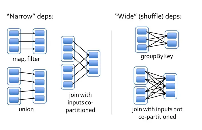 以下是文章 <RDD:基于内存的集群计算容错抽象> 中对宽依赖和窄依赖的对比。