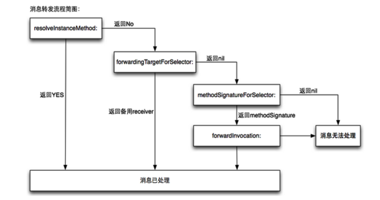 -methodSignatureForSelector:获取到方法签名后,将消息封装为一个invocation再调用-forwardInvocation:进行处理。 可见,当一个方法没有实现时,runtime给了3次机会让我们进行处理。 下面是动态方法解析和消息转发的流程: