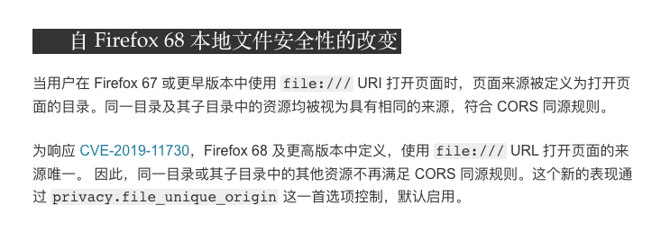 大意是:火狐68版本以前本地跨域是允许的,被一个人提了bug之后后面版本不再允许跨域了。