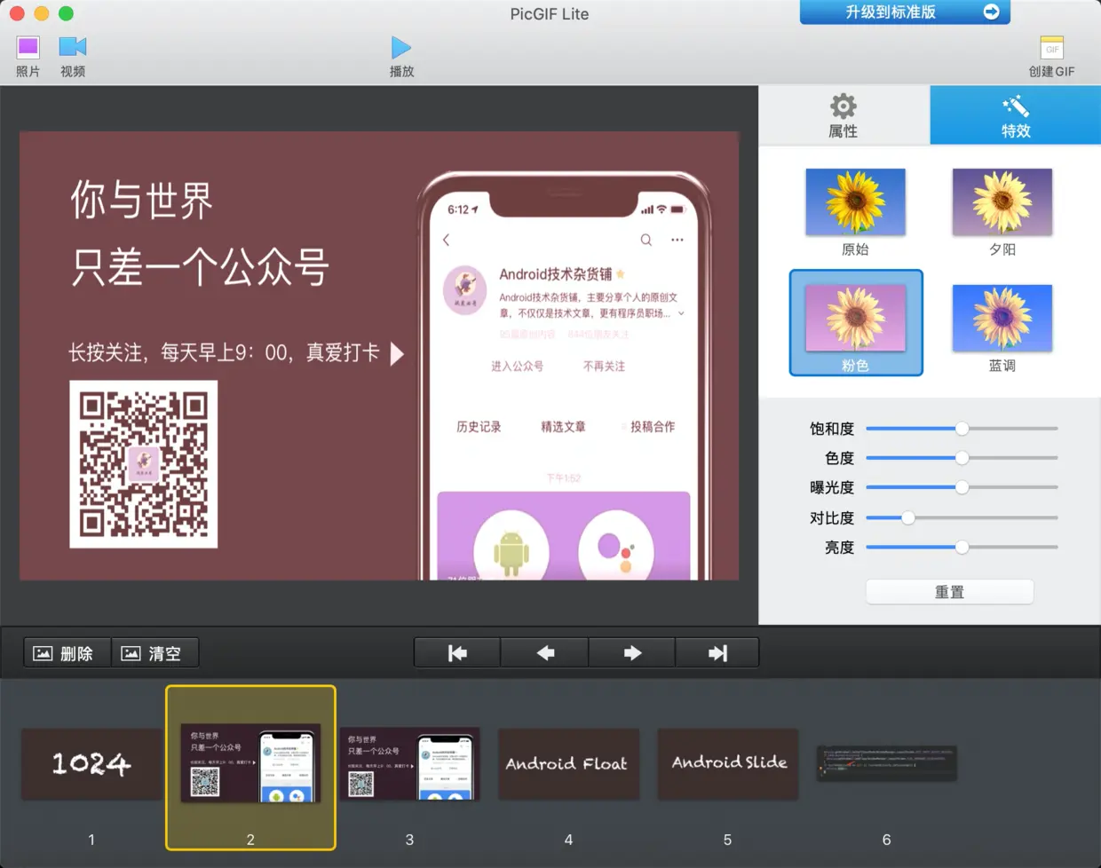 除了视频转Gif之外,还有一个功能就是把多张照片合成Gif。每一张张片就是gif的一帧。可以看到,右边的工具栏可以加很多特效,非常酷。