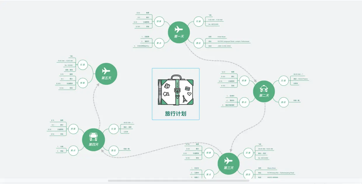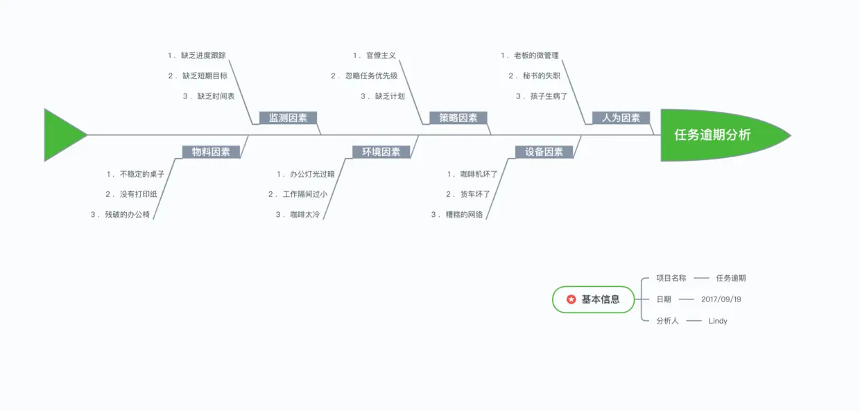 此外,Xmind还提供了另外一种逾期任务模式的图,俗称鱼骨头,因为它长得就像一条鱼的样子,这种样式适合做一个任务计划,因为每一步都是计划好的,有确定的时间节点。帮助我们按照计划进行。