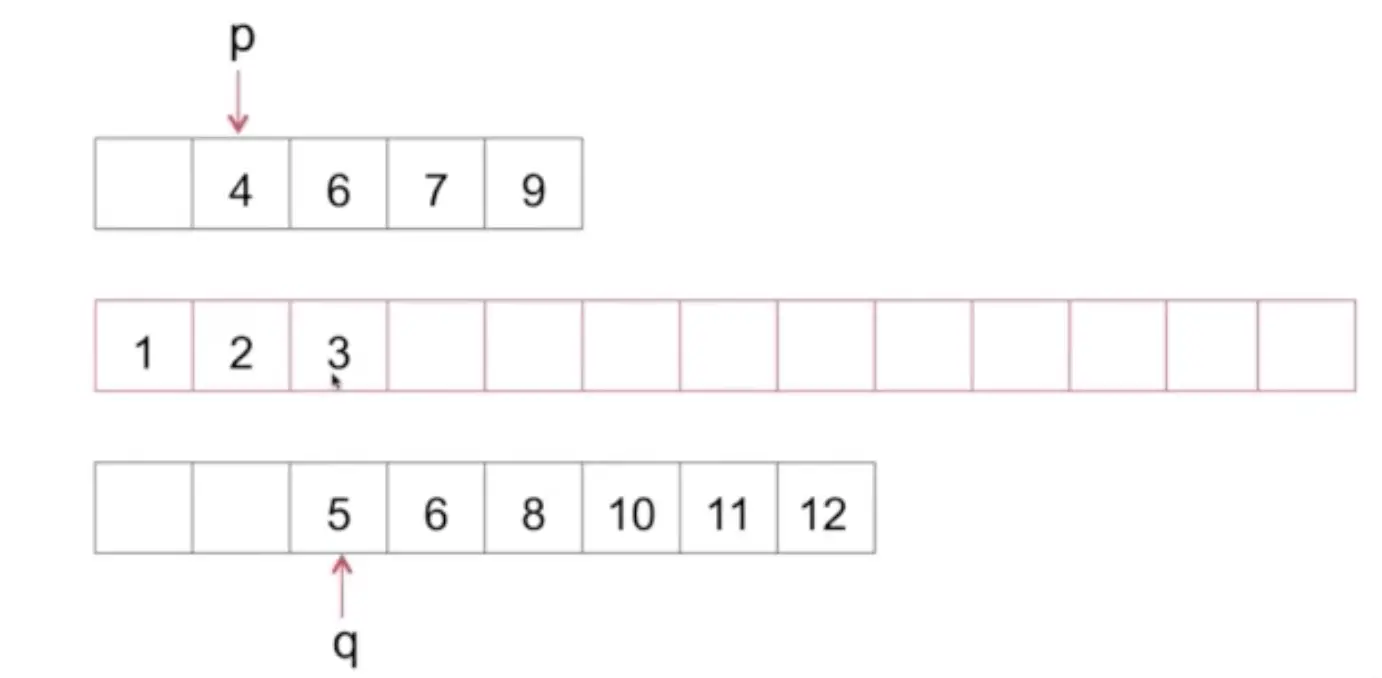 思路:两个数组分别用指针遍历对比,放到新的数组